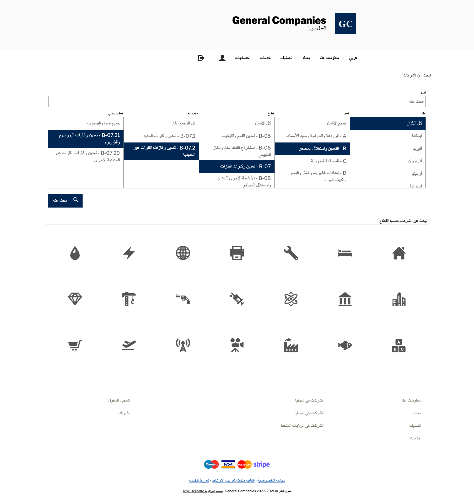 La parte principal del proyecto es el buscador de empresas que permite filtrar resultados por nombre, país o clasificación. El proyecto debía ser multi idioma y estar traducido a diferentes idiomas, entre ellos Chino o Árabe con las propiedades técnicas que estos idiomas pueden causar.